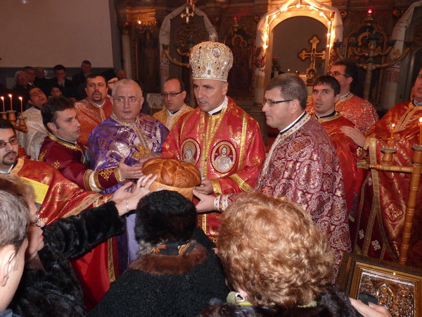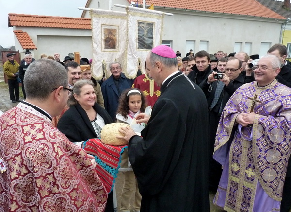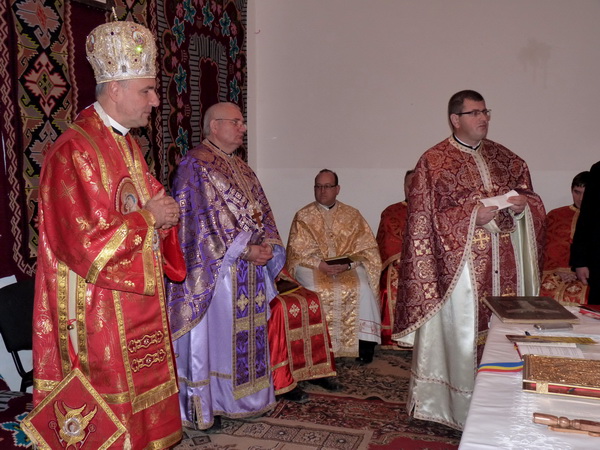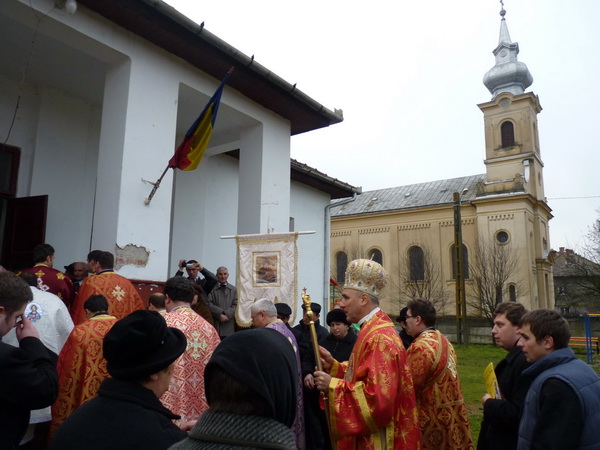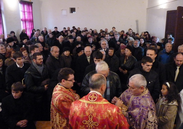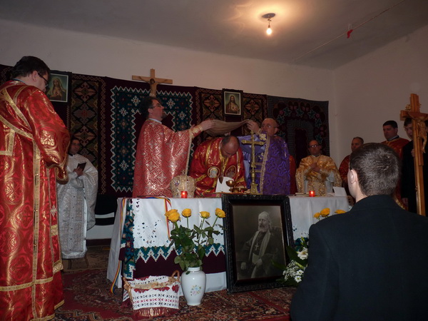 Preasfinția Sa Virgil a fost întâmpinat însă la capela greco-catolică (aflată încă în construcție) de Pr. Paul Turcu, vicar mitropolitan și protopop de Teiuș, de Pr. paroh Adrian Bișboacă dimpreună cu un numeros sobor de preoți și multime de credincioși; de aici s-a plecat în procesiune spre Căminul cultural, unde, pe un altar improvizat, s-a săvârșit Sfânta Liturghie. Toate acestea, deoarece biserica ctitorită de Episcopul Demetriu Radu este încă în posesia Parohiei Ortodoxe din localitate.