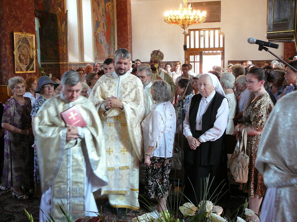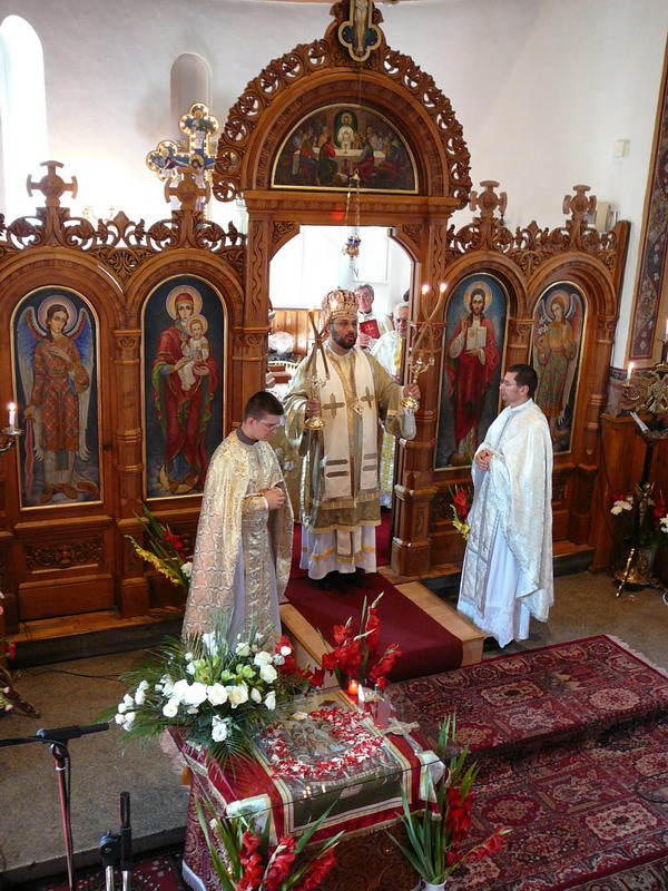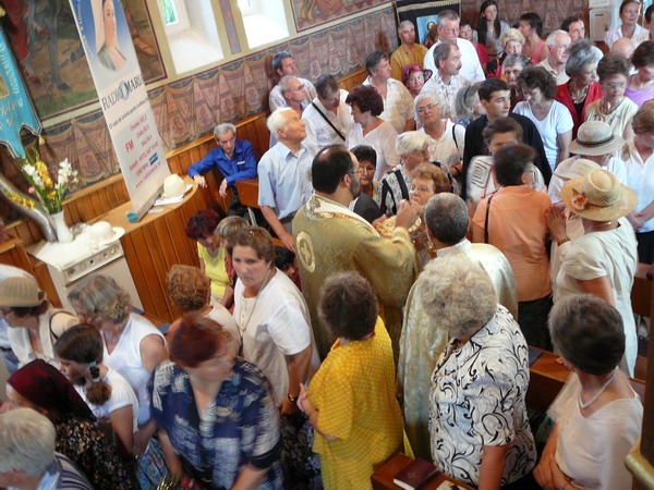Biserica „Adormirii Maicii Domnului” din Bucureşti şi-a sărbătorit azi hramul în prezenţa episcopului PS Mihai şi a numeroşi credincioşi din capitală care au invadat efectiv biserica şi curtea parohiei, cei din curte urmărind Sfânta Liturghie proiectată pe un ecran.