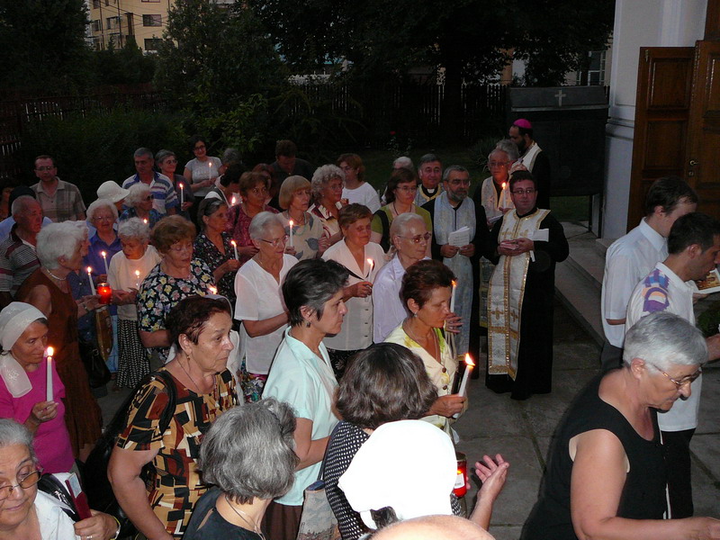 Alături de părintele protopop Liviu Oţoiu şi toţi preoţii din Bucureşti (doar părintele Dan Cristian Popescu era absent din cauza unui pelerinaj cu un grup de tineri în Sardinia), PS Mihai a celebrat joi seara Vecernia mare a sărbătorii cu Prohodul Maicii Domnului şi procesiunea în jurul bisericii.