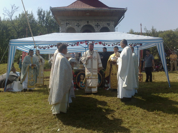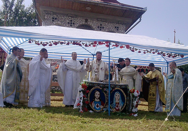 Sfânta Liturghie de la ora 10,30 a fost pontificată de Preasfinţitul Vasile Bizău reprezentant al Curiei Arhiepiscopiei Majore a Biserici Române Unite cu Roma alături de Protopopul Reghinului, Boitoş Ignat Florin cu încă 10 preoţi din protopopiatele Reghin, Tg-Mureş şi Teaca în faţa a peste 1500 de pelerini adunaţi sub prelate,corturi, umbrele şi pomii din apropiere pentru a se proteja de sorele arzător au avut parte de momente înălţătoare de rugăciune şi reculegere la cuvântarea deosebită ţinută de Preasfinţia Sa. Răspunsurile au fost date ca şi în anii trecuţi de admirabilul cor de la Tg-Mureş condus acum de către Părintele Miheţ Flaviu.