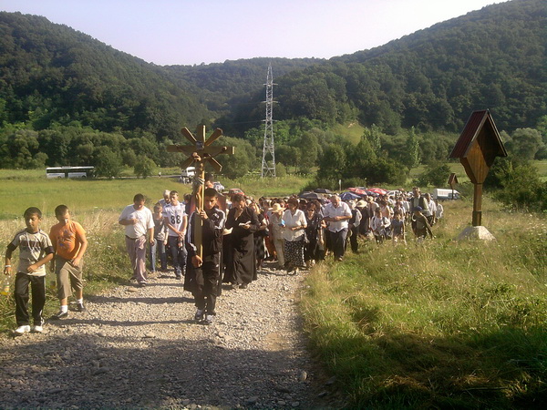 Cu toate că era dimineaţă, soarele dogora cu putere o căldură ca de cuptor. Sutele de pelerini sosiţi la locul de pornire a procesiunii cântând alături de Părintele Farcaş Zaharie cu umbrele şi cărticele au început urcuşu ducând Crucificxul şi icoana Maici Domnului lăcrimând prin faţa celor 15 troiţe cu basoreliefuri ale staţiunilor de la Calea Crucii. Crucea a fost purtată şi înmânată între pelerini sosiţi din Tg- Mureş, Cluj, Braşov, Bucureşti, Reghin, Teleac, Petelea, Hodac, Ibăneşti, din satele vecine Conunei Beica de Jos, Chiheru de Jos, Urisiu de Jos, ca semn al comuniuni în suferinţă şi credinţă fiecare punând de la început o intenţie de rugăciune pentru ei, familile lor şi cei dragi ai lor.