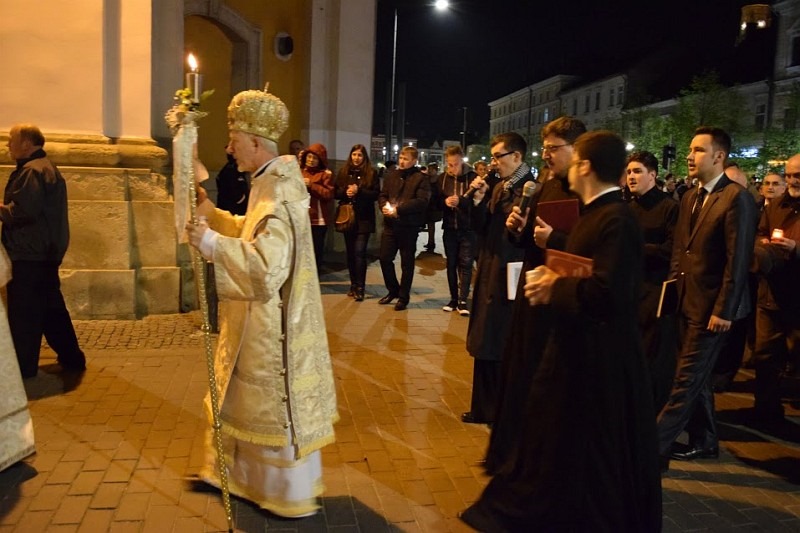 Celebrarea Învierii Domnului nostru Isus Hristos a început, în Catedrala „Schimbarea la Față” din Cluj-Napoca prin Utrenia Învierii, sâmbătă, 15 aprilie 2017, de la ora 23.00. La cuvântul Episcopului greco-catolic de Cluj-Gherla, PS Florentin Crihălmeanu: „Veniți de luați lumina!”, lumina a izvorât din noapte spre cer prin sutele de lumânări aprinse. Studenții Seminarului Teologic eparhial „Sf. Ioan Evanghelistul”, cu vocile și rugăciunea lor îmbrăcate în frumusețea și profunzimea ritului bizantin, au făcut ca bucuria și tainica putere a Învierii să umple sufletele credincioșilor, mai întâi afară, la rugăciunea din fața bisericii și apoi în Catedrala luminată.