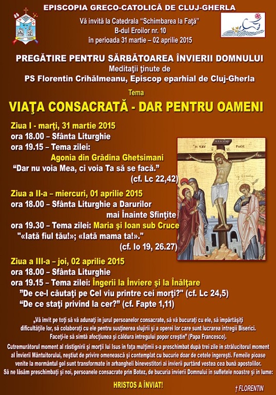 Intrând în ultimele două săptămâni ale Postului Mare, Biserica îşi intensifică programul de pregătire spirituală, invitându-i pe credincioşi la rugăciune pentru a trăi, în lumina lui Cristos, marea Sărbătoare a Învierii Domnului, fixată în calendarul liturgic la data de 12 aprilie 2015. Urmând tradiţia anilor precedenţi, Episcopul greco-catolic de Cluj-Gherla, Preasfinţitul Florentin Crihălmeanu, va prezenta un ciclu de meditaţii ce vor avea loc în Catedrala episcopală Schimbarea la Faţă (B-dul Eroilor nr. 10, Cluj-Napoca), în perioada 31 martie – 2 aprilie 2015, zilnic după Sfânta Liturghie de la ora 18.