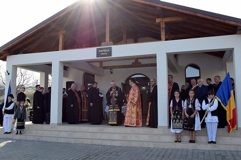 În continuare, la invitația Primăriei Frata, Episcopul, preoții și credincioșii greco-catolici s-au îndreptat spre capela mortuară nou construită la inițiativa primarului Trif, unde, împreună cu comunitatea ortodoxă, care-l avea în mijlocul său pe IPS Arhiepiscop și Mitropolit Andrei Andreicuț, s-a trecut la binecuvântarea locașului ridicat, ca „poartă de intrare” în Cereasca Împărăție. IPS Andrei și un sobor de preoți au celebrat ceremonia de sfințire, după care PS Florentin și preoții greco-catolici au oficiat rânduiala Parastasului pentru odihna sufletelor celor trecuți la Domnul. Deși separate formal prin decretul încă în vigoare al Sfântului Sinod, care nu permite preoților ortodocși să concelebreze cu cei greco-catolici, cele două comunități au fost de fapt unite în rugăciune și meditație în fața simbolismului acestei capele, care pune pe fiecare om în fața inevitabilei realități a morții. Amândoi Ierarhii au rostit câte un cuvânt, felicitând autoritățile pentru realizarea capelei și subliniind datoria celor vii de a se preocupa de cei care trec la Domnul.