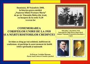 În ziua de 30 noiembrie (Sărbătoarea Sf .Andrei) arădenii au participat la biserica greco-catolică „Naşterea Sf. Fecioare Maria” (de pe Str. Vincenţiu Babeş ) la comemorarea Corifeilor Marii Uniri de la 1 Decembrie 1918, a martirilor şi mărturisitorilor Bisericii Greco-Catolice, a eroilor neamului şi a deţinuţilor din închisorile comuniste.