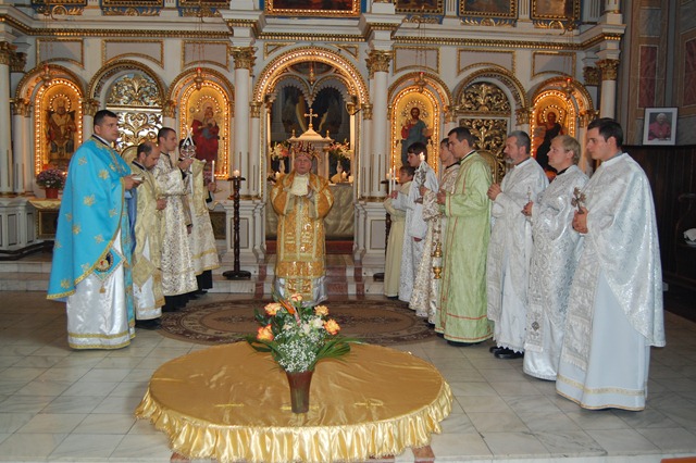 La masa altarului alături de Prea Sfinţia Sa Alexandru Mesian s-au aflat: mons. Angelo-Narcis Pop, Vicar general al eparhiei de Lugoj, pr. Dănuţ Ciuban, protopop de Chişineu-Criş, pr. Ioan Cosmin Fărcaş, paroh la Beliu, pr. Ioan Pop, parohul catedralei şi pr. Ovidiu Rănescu, paroh la Şanoviţa. Răspunsurile liturgice au fost date de corul „Reînvierea” al catedralei, dirijat de d-na Prof. Olimpia Drăgan.