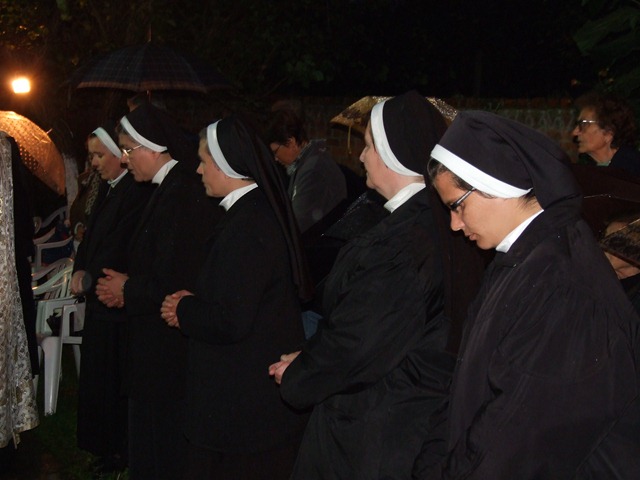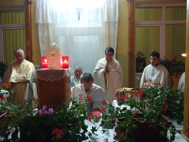 După Sfânta Liturghie a urmat Binecuvântarea Euharistică, clerul, Surorile şi mulţimile de credincioşi rugându-se în faţa Mântuitorului Isus Cristos prezent în Sfânta Euharistie.