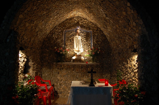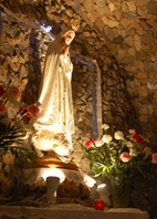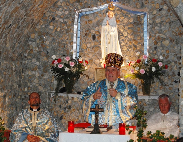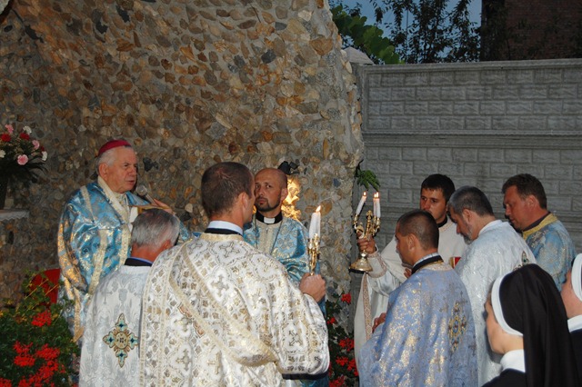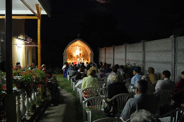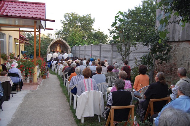 După Rugăciunea Rozarului de la catedrală, la orele 18.30 s-a plecat în procesiune spre mănăstirea Surorilor de pe strada Victor Vlad Delamarina. La orele 18:45 în curtea mănăstirii a început Vecernia Sărbătorii. Credincioșii au avut plăcuta surpriză de a admira noul altar ridicat în toamna anului trecut în curtea mănăstirii: o frumoasă grotă în care este aşezată statuia Sfintei Fecioare Maria de la Fatima. După rânduiala Vecerniei, a urmat Sfânta Liturghie pontificată de Prea Sfinţia Sa Episcop Alexandru Mesian. Au concelebrat: Vicarul General Mons. Angelo-Narcis Pop, pr. Cons. Baba Teodor, Protopopul Lugojului, pr. Ioan Pop, parohul Catedralei, pr. Olariu Cristian, Paroh la Balinţ, pr. Ioan Brândău, paroh la Budinţ şi pr. Ovidiu Rănescu, paroh la Şanoviţa. Lector a fost Narcis Ardelean. Răspunsurile au fost date de corul catedralei „Reînvierea” dirijat de D-na Prof. Olimpia Drăgan.