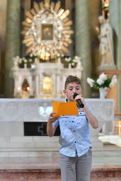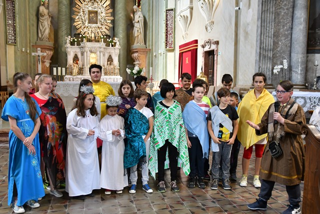 Tinerii din parohia Lugoj conduşi de Cuvioasa Sr. Valeria OSBM au deschis programul artistic, cu sceneta „Învierea Domnului” În continuarea programului artistic, tânărul, Petcu Adrian în vârstă de 11 ani din parohia Semlac, a interpretat câteva pricesne.