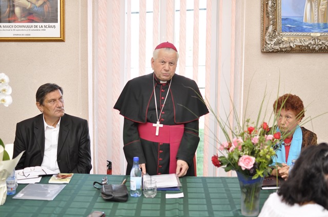 La sosire, participanții au fost întâmpinați cu multă căldură de însuși Excelența Sa, Preasfințitul Episcop Alexandru la palatul episcopal, începându-se astfel, prin binecuvântarea sa arhierească lucrările acestei conferințe. Preasfințitul episcop Alexandru ne-a amintit de importanța rugăciunii Sfântului Rozariu, care provine etimologic de la latinescul rosarium (coroană de trandafiri), ilustrându-l printr-un minunat exemplu: așa cum într-o grădină găsim trandafiri de diferite tipuri și culori, în Rozariul Maicii Domnului găsim patru soiuri deosebite de trandafiri, fiecare grupat în buchete de câte cincizeci de fire: un buchet de bucurie, unul de lumină, unul de durere și unul de mărire. În aceste buchete cinstim cele mai însemnate mistere ale vieții, pătimirii și măririi lui Isus Cristos și ale Preasfintei Fecioare Maria. Ca un prim îndemn, Preasfinția Sa ne-a invitat să trăim spiritul marianist în credință, iubire, în rugăciune plină de evlavie și speranță, slujind lui Dumnezeu prin mijlocirea Sfintei fecioare, spre gloria Sa, întărirea Bisericii și mântuirea sufletelor. De asemenea ne-a asigurat de prezența sa alături de noi în aceste zile de har și a salutat cu multă bucurie delegațiile din diferitele eparhii ale Bisericii noastre: din Blaj, îndeosebi pe pr. Ioan Fărcaș – părintele spiritual al R.M. din Arhiepiscopia Majoră și doamna prof. dr. Angela Groza – președinta națională a R.M., împreună cu toți ceilalți delegați, preoți și marianiști din eparhiile de Baia Mare, Cluj-Gherla, Oradea Mare, București și Lugoj. Doamna prof. dr. Angela Groza ne-a transmis și mesajul Preafericirii Sale, Cardinalul Lucian, Arhiepiscop Major prin care salută pe toți participanții la această întrunire, oferindu-le arhiereasca sa binecuvântare. În continuare, părintele Cristian Chișvasi – consilier R.M. Lugoj, a prezentat programul acestor conferințe, întocmit de comitetul eparhial R.M. Lugoj și aprobat de Preasfinția Sa, Episcopul Alexandru.