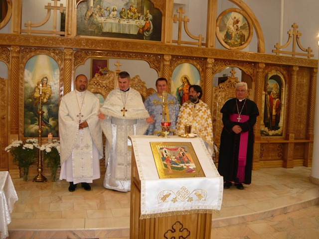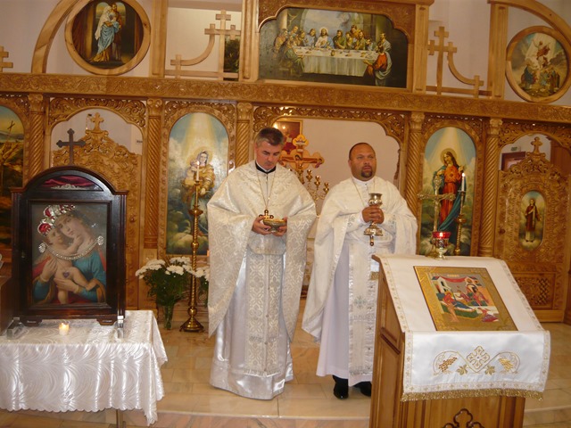 Programul a început cu Sfânta Liturghie. Alături de pr. Radu Vorindan, protopop de Arad şi parohul locului, au concelebrat: părintele ieromonah Isaac de la Mănăstirea Preasfânta Treime, pr. Nicolae Didi, paroh la Turdaş şi pr. Iulian Hasciar, paroh la Scăiuş care a însoţit icoana. Alţi preoţi invitaţi care au sosit după ce şi-au celebrat Sfintele Liturghii în parohiile învecinate au fost: pr. Romeo Bodea, paroh la Arad-Micălaca, pr. Marcel Tarce, paroh la Cruceni, pr. Ovidiu Crişan, paroh la Zădăreni şi pr. Sorin Seviciu, paroh la capela „Bunavestire” Arad-Centru.