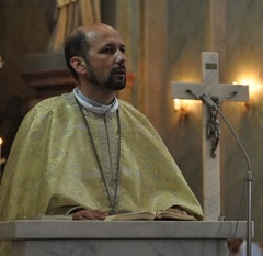 Mons. Angelo a transmis credincioşilor din partea Prea Sfinţitului Alexandru Mesian salutul şi binecuvântările arhiereşti. P.S. Alexandru în această perioadă s-a aflat la Iaşi unde a avut loc ceremonia de beatificare a Episcopului martir Anton Durcovici. În cuvântul său Mons. Angelo a vorbit mai întâi despre Evanghelia zilei, apoi a subliniat faptul că în acest an pelerinajul la Bazilica Maria Radna are loc într-un context special pentru că în Eparhia de Lugoj anul 2014 este declarat ca fiind An Marian, dedicat Maicii Domnului de la Scăiuş, un alt centru de pelerinaj în curs de dezvoltare.