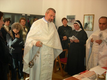 Fiind pregătiţi sufleteşte, întreg grupul s-a îndreptat spre Mănăstirea „Naşterea Sf. Fecioare Maria” a Surorilor Baziliene, pentru rugăciunea Vecerniei în cadrul căruia a avut loc primirea noilor membri terţiari de către PS Episcop Alexandru Mesian şi de Superioara Provincială Maica Valentina Hădărău, OSBM. După rostirea angajamentului, PS Alexandru a înmânat noilor membri cruciuliţe şi diplome. Terţiarii mai vechi şi-au reînnoit angajamentul în faţa Altarului, după care au primit şi dânşii diplome.
