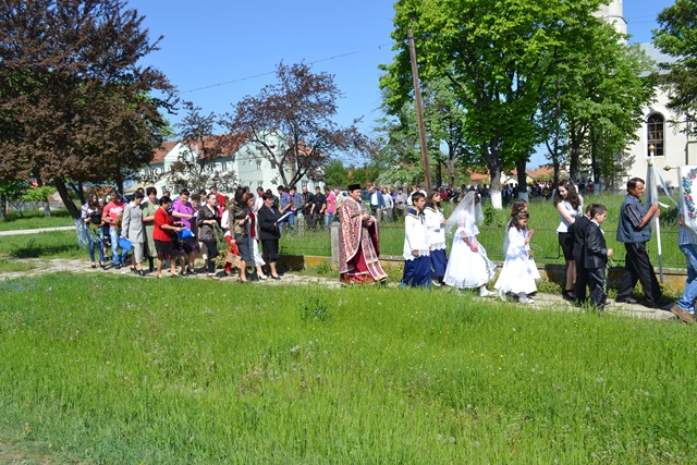 Celebrarea a început cu sfinţirea stâlpărilor, apoi cu o procesiune solemnă în jurul parcului în care se află statuia Sf. Ioan Nepomuk. La procesiune pe lângă credincioşii din parohie, au participat copiii îmbrăcaţi haine specifice pentru prima împărtăşanie, ca un semn al purităţii şi inocenţei, pe care şi-au dobândit-o printr-o spovedanie bună, însoţiţi de preotul Ioan Grad, parohul locului.