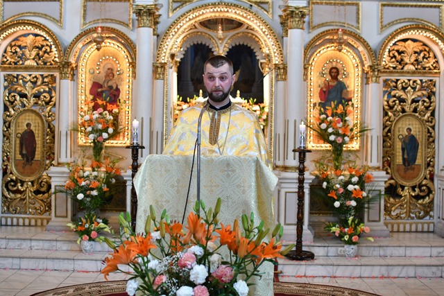 Predica sărbătorii a fost ţinută de pr. Flavius Jurca. Părintele Flavius a vorbit mai întâi despre originile şi semnificaţia Sărbătorii Rusaliilor. A continuat cu episodul coborârii Sfântului Spirit peste ucenici. „Prin Spiritul Sfânt”, a spus pr. Flavius, „prin darurile ce el le poartă în această comunitate de ucenici din viața lor, de fapt se naște Biserica. Biserica nu poate fi în alt loc decât acolo unde harul lui Dumnezeu şi darurile sale se coboară asupra comunităţii. De fapt Spiritul este învăţătorul prin excelenţă al fiecăruia dintre noi. Ni se spune că după Coborârea Spiritului Sfânt, toţi cei prezenţi în acea piaţă din Ierusalim, indiferent de limba pe care o vorbeau au înţeles mesajul pe care îl predicau apostolii. De fapt ceea ce vrea să ne transmită Sfântul Evanghelist Luca în cartea Faptele Apostolilor este faptul că Mesajul lui Dumnezeu este adresat fiecărui om în parte, indiferent de limba pe care o vorbeşte, indiferent de care etnie aparţine şi indiferent de capacităţile sale mai mici sau mai mari. Cristos s-a înălţat la cer, dar prin coborârea Spiritului Sfânt de Rusalii, El rămâne în istorie şi continuă să lucreze în istorie. Spiritul Sfânt e cel care ni-l face cunoscut pe Tatăl şi pe Fiul”.
