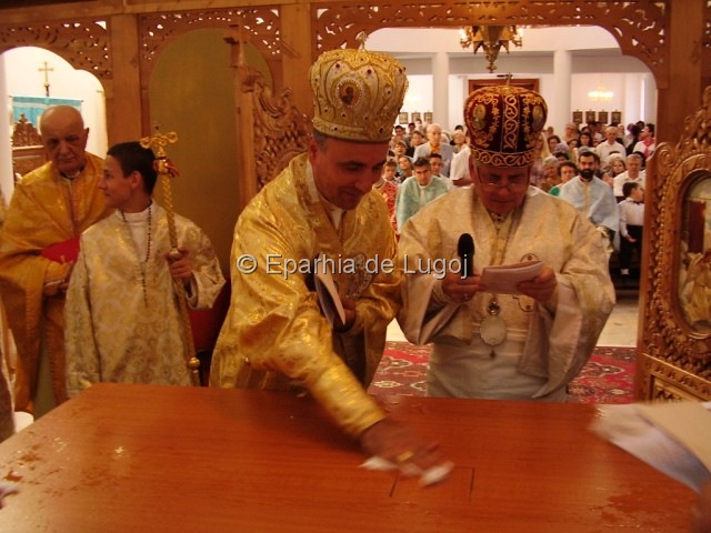 Dimineaţa la ora 9.45 cei doi Episcopi au fost întâmpinaţi de preoţi şi de sutele de credincioşi prezenţi cu pâine şi sare. A urmat ritualul de sfinţire a apei, sfinţirea troiţei din faţa bisericii, a bisericii în exterior şi apoi a lăcaşului de cult în interior. În altar au fost introduse moaştele şi un hrisov cu istoricul acestei construcţii. Sfânta Liturghie a început la ora 11.00 , pontificând ES Mons. Episcop Alexandru Mesian de Lugoj şi ES Mons. Episcop dr. Virgil Bercea de Oradea, concelebrând Pr. Angelo Narcis Pop – Protosincel de Lugoj, Pr. Mihai Todea – Protosincel de Cluj-Gherla, Pr. drd. Coriolan C. Mureşan – Vicar Judecătoresc al Eparhiei de Lugoj şi Asistent spiritual naţional al AGRU, Pr. drd. William Bleiziffer – Vicar Judecătoresc al Arhieparhiei de Alba Iulia şi Făgăraş şi Cancelar al Curiei Arhiepiscopale Majore, Pr. conf. univ. dr. Ioan Mitrofan – Econom al Bisericii Greco-Catolice, Pr. canonic Kiraly Arpad – Arhidiacon romano-catolic de Mureş şi paroh Arad-Sega, Pr. drd. Cristian Sabău – Rector al Seminarului Major din Oradea, Pr. drd. Marius Petru Pop – Cancelar al Eparhiei de Lugoj, Pr. Florin Sescu – Asistent spiritual al ACRO copii, Pr. Nistor Chişbora – consilier eparhial şi protopop greco-catolic, Pr. prot. on. Coriolan Mureşan – consilier eparhial şi paroh Arad-centru, Pr. Vasile Butean – protopop de Chioar, Pr. Ioan Chişărău – asistent spiritual "Reuniunea Mariană" din Eparhia de Lugoj, Pr. Liviu Oţoiu – protopop de Bucureşti, Pr. drd. Vasile Bizău – profesor la Facultatea de Teologie Greco-Catolică din Baia Mare, Pr. drd. Horaţiu Cipleu – asistent spiritual al AGRU Cluj, protopopii Eparhiei de Lugoj (Pr. Nicolae Teodorescu – protopop de Timişoara şi consilier eparhial, Pr. Marian Ştefănescu – protopop de Reşiţa, Pr. Teodor Baba – protopop de Lugoj şi consilier eparhial, Pr. Micu Ceciliu – protopop de Deva, Pr. Adrian Nagy – protopop de Lupeni, Pr. Florin Vasiloni – protopop de Sarmisegetusa, Pr. Pavel Dragotă -protopop de Haţeg), Pr. Davide Muntoni din comunitatea “Fraţii Sfintei Cruci”, Mons. Rene Bremond (Franţa) precum şi preoţi din judeţele Arad şi Timiş.