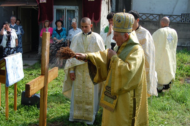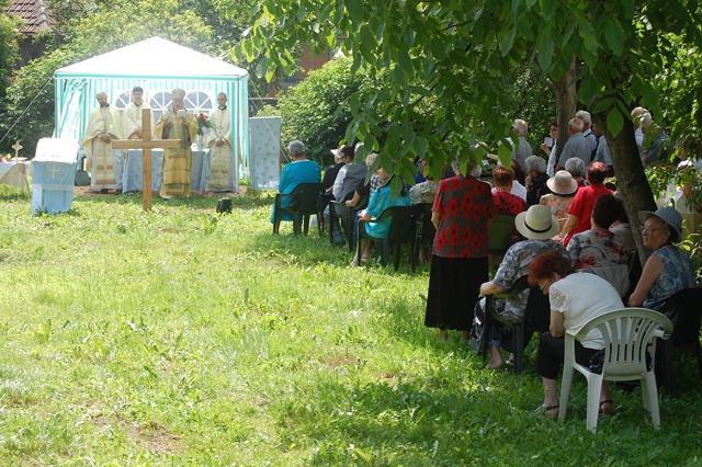 Ceremonia a început la orele 10.00 cu oficiul sfinţirii apei, urmat de sfinţirea locului de biserică, a credincioşilor şi a pietrei de temelie a noii biserici şi crucea.