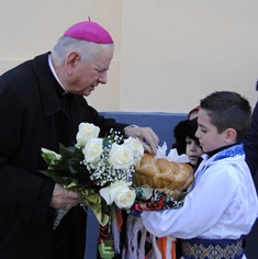 La sosire P.S. Alexandru a fost întâmpinat cu Sfânta Cruce şi Sfânta Evanghelie de Pr. Radu Vorindan, consilier eparhial şi protopop de Arad, Pr. Felician Kadar, parohul locului şi de un sobor de preoţi din protopopiat. Un grup de copii i-au oferit Ierarhului buchete de flori.