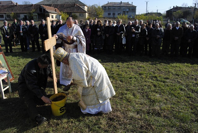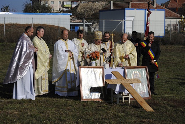 Ceremonia a început cu oficiul sfinţirii apei, urmat de sfinţirea locului de biserică, a credincioşilor, a pietrei de temelie şi implantarea crucii din lemn.