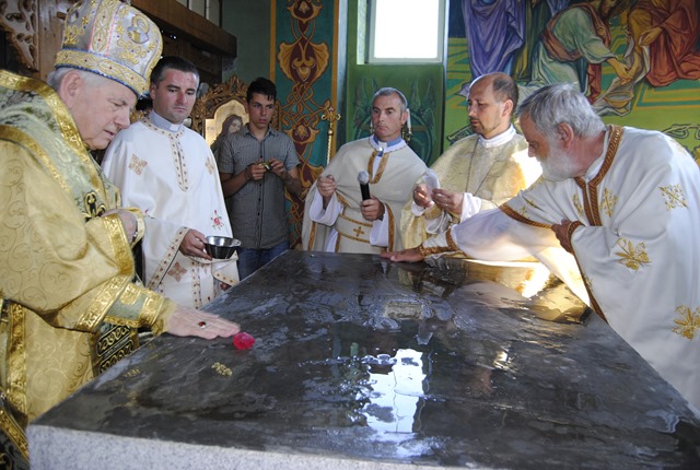 Ceremonia religioasă a început cu oficiul sfinţirii apei, desfăşurat în faţa intrării în biserică, după care a urmat binecuvântarea lăcaşului de cult, prin ungerea zidurilor exterioare şi interioare cu sfântul şi marele mir, în formă de cruce, şi prin stropire cu apă sfinţită. De-asemenea s-au sfinţit icoanele de pe iconostas şi masa altarului. Mons. Angelo-Narcis Pop a dat citire Hrisovului, în care se arată că după 41 de ani, biserica greco-catolică a revenit la ceea ce a fost, deoarece înainte de 1989 aceasta era scoasă în afara legii. În masa altarului au fost aşezate moaşte ale Sfintei Suzana fecioară și martiră.