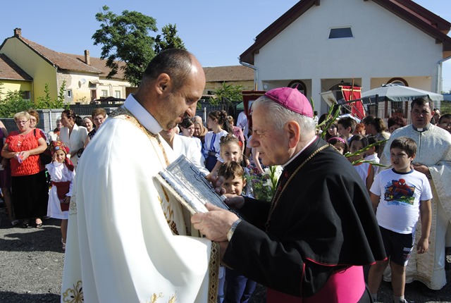 La sosire P.S. Alexandru a fost întâmpinat în faţa noului lăcaş de cult cu Sfânta Cruce şi Sfânta Evanghelie de către Pr. Felician Kadar, parohul locului împreună cu un sobor de preoţi din protopopiat. Un grup de copii i-au oferit Ierarhului buchete de flori.