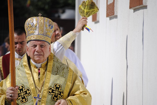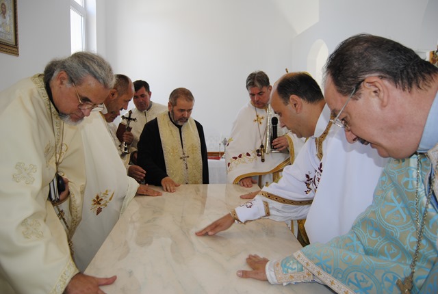 Ceremonia religioasă a început la orele 10.00 cu oficiul sfinţirii apei, desfăşurat pe esplanada din faţa intrării în biserică, după care a urmat binecuvântarea bisericii, prin ungerea zidurilor exterioare şi interioare cu sfântul şi marele mir, în formă de cruce, şi prin stropire cu apă sfinţită. De-asemenea s-au sfinţit icoanele de pe iconostas şi masa altarului. Mons. Angelo-Narcis Pop a dat citire Hrisovului. Redăm câteva informaţii din acest document: