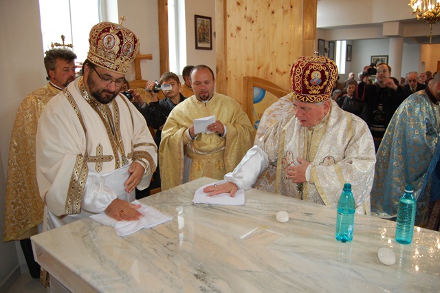 Ceremonia religioasă a început la orele 10.00 cu oficiul sfinţirii apei, desfăşurat pe esplanada din faţa intrării în biserică, după care a urmat binecuvântarea bisericii, prin ungerea zidurilor exterioare şi interioare cu sfântul şi marele mir, în formă de cruce, şi prin stropire cu apă sfinţită.
