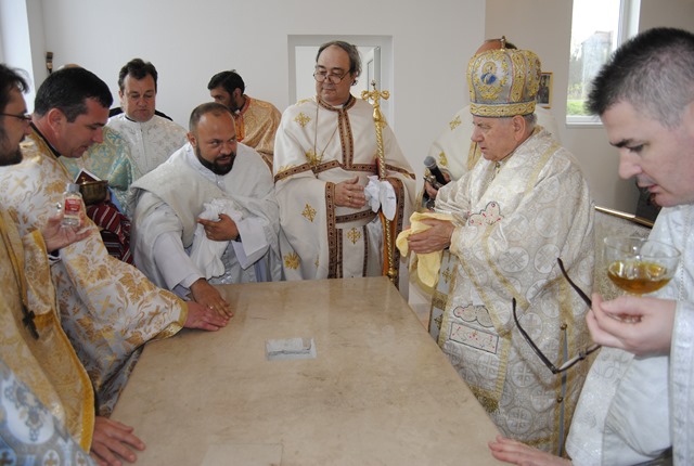 Ceremonia religioasă a început la orele 10.00 cu oficiul sfinţirii apei, desfăşurat în faţa bisericii, după care a urmat binecuvântarea noului lăcaş de cult, prin ungerea zidurilor exterioare şi interioare cu Sfântul şi Marele Mir, în formă de cruce, şi prin stropire cu apă sfinţită. De-asemenea s-a sfinţit şi masa altarului în care au fost aşezate moaşte ale Sfinților Sergiu și Bach. Mons.Angelo Narcis Pop a dat citire Hrisovului. Redăm câteva informaţii din acest document: