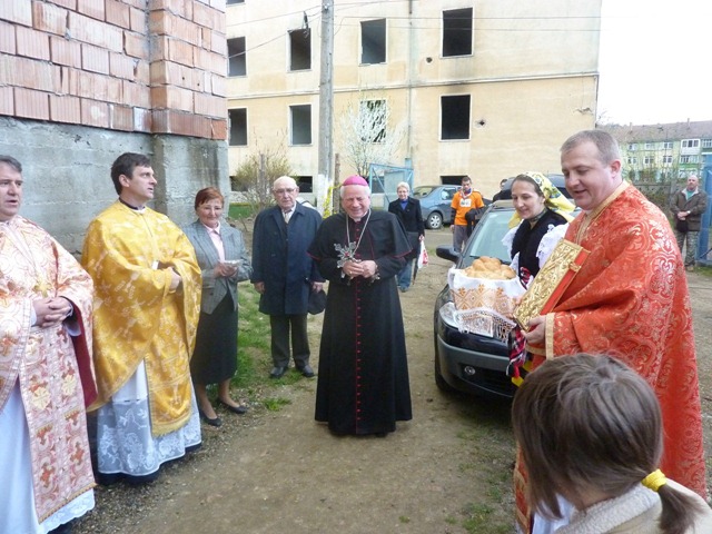 După întâmpinarea cu pâine și sare a urmat întâmpinarea cu Sf. Cruce purtată de către Pr. Prot. Silviu Bindea și cu Sf. Evanghelie purtată de către Pr. Paroh Viorel Codrea, aceștia fiind însoțiți la întâmpinarea episcopului Alexandru de către toți preoții prezenți.