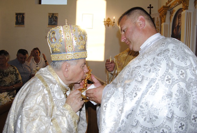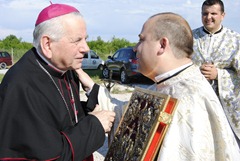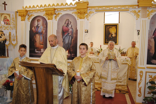 La sosire, P.S. Alexandru a fost întâmpinat în faţa bisericii cu Sfânta Evanghelie şi Sfânta Cruce de pr. Dănuţ Ciuban protopop de Chişineu-Criş şi de pr. Augustin Budău O.F.M.Conv. parohul locului.