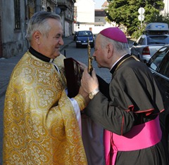 La sosire, P.S. Alexandru a fost întâmpinat cu Sfânta Cruce şi Sfânta Evanghelie de pr. Prot. On. Nicolae Lungu, parohul locului. La Sfânta Liturghie Arhierească, alături de Prea Sfinţitul Alexandru au concelebrat: Mons. Angelo-Narcis Pop, Vicar General, pr. Nicolae Teodorescu, consilier eparhial şi protopop de Timişoara şi pr. Nicolae Lungu.