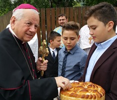Copiii parohiei şi-au întâmpinat Ierarhul cu flori, pâine şi sare, conform tradiției.