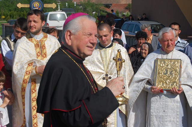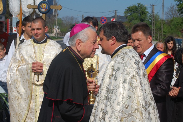 În faţa bisericii Prea Sfinţia Sa a fost întâmpinat cu Sfânta Cruce şi Sfânta Evanghelie de Rvs. Pr. Teodor Baba, Consilier eparhial şi Protopop greco-catolic al Lugojului.