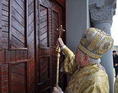 Ceremonia religioasă a început la orele 10.30 cu oficiul sfinţirii apei, după care a urmat binecuvântarea bisericii, prin stropirea cu apă sfinţită, ungerea zidurilor exterioare cu sfântul şi marele mir, în formă de cruce şi binecuvântarea Crucii luminoase de iubire aflată în faţa bisericii.