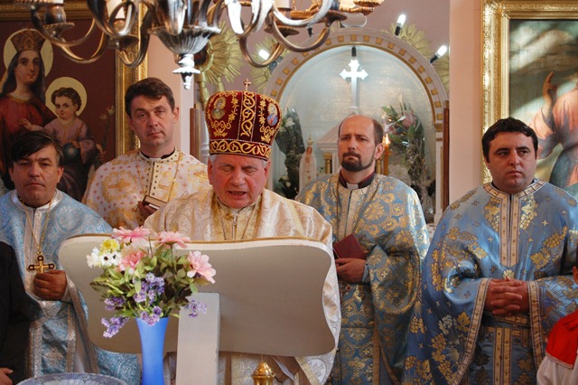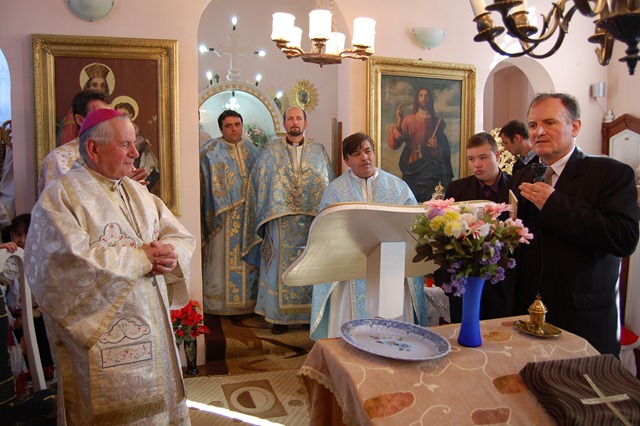 Ceremonia religioasă a început la orele 10.00 cu oficiul sfinţirii apei, desfăşurat pe esplanada din faţa intrării în biserică, după care a urmat binecuvântarea bisericii, prin ungerea zidurilor exterioare cu sfântul şi marele mir, în formă de cruce, şi prin stropire cu apă sfinţită.