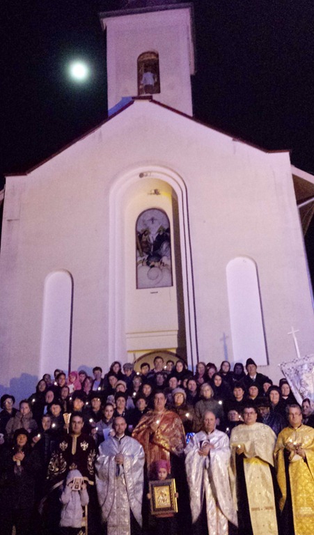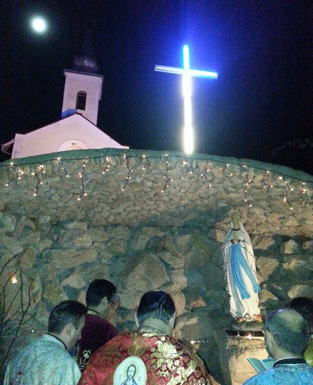 După celebrarea Sfântului Maslu, fiecare dintre credincioși au primit miruirea cu Untdelemnul sfințit, și un pahar de apă miraculoasă adusă de a Lourdes, acolo unde o parte din credincioșii din Cetatea de Baltă, în luna iulie 2013 au fost în pelerinaj împreună cu o comunitate de credincioși din Toulon-Franța. Programul a continuat cu o fotografie de grup în fața bisericii după care sa început procesiune cu lumânări aprinse către locul unde este amplasată grota. În sunetul emoționant al clopotelor și cu inimile pline de emoție și bucurie, cântând imnul Lourdes „Fecioara la munte pe stânci apăru”…. s-a ajuns la grotă, iar în fața Statui Maicii Domnului Imaculata concepțiune și a Sfântei Bernadeta Soubirous, s-a cântat Litania Lauretană, s-a făcut rugăciune către Maica Sfântă, iar apoi fiecare dintre cei prezenți au depus o lumânare aprinsă la grotă, simbol al luminii și al speranței pe care Lourdes-ul a adus-o în viața multor bolnavii și creștini din lumea întreagă.