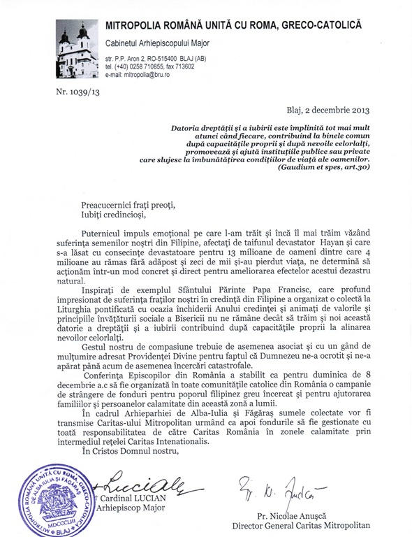Circulara PF Lucian – Ajutor pentru Filipine