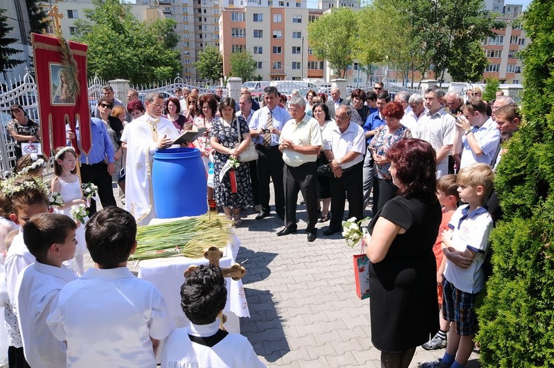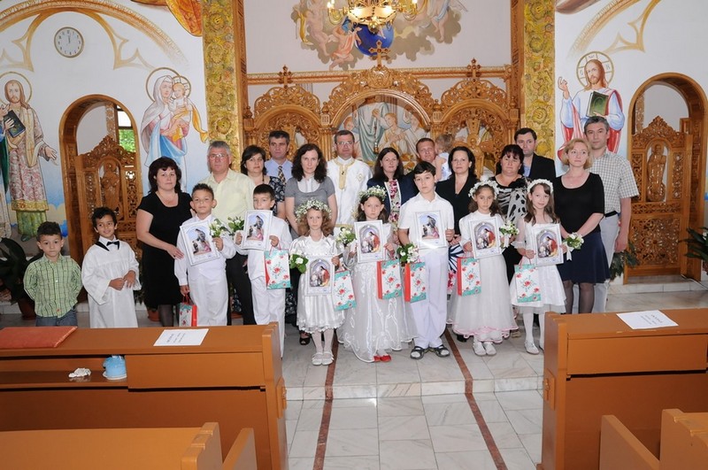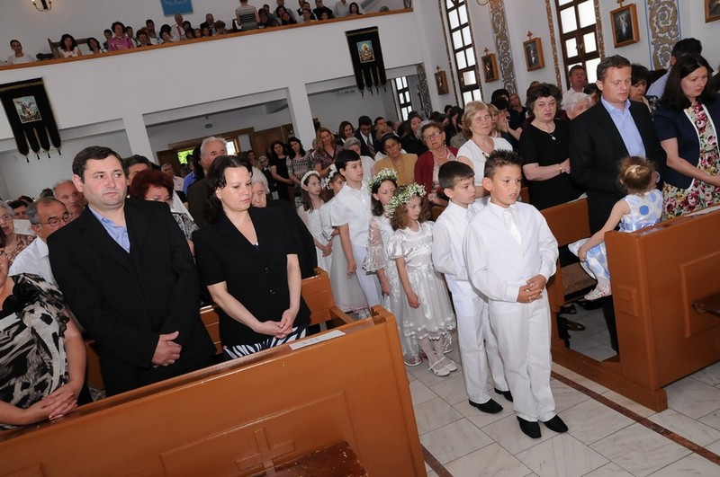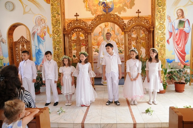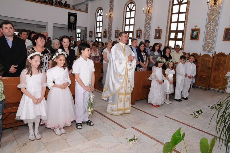 Duminică dimineaţa, în sunetul clopotelor, a început obişnuita procesiune din faţa bisericii, în care copiii, grupaţi câte doi şi însoţiţi de preotul Ioan Fărcaş, au venit în faţa altarului. Momentul a fost încărcat de simboluri: hainutele albe ale copiilor, buchetele de flori albe pe care aceştia purtau în mâini, erau semene ale nevinovăţiei şi curăţiei din sufletele lor, iar glasul cântecului lor scotea în evidenţă că nu mică le era emoţia întâlnirii cu Isus în sfânta Taină. „Fericită-i ziua aceasta, când primesc în dar de sus, pâinea cea dumnezeiască, trupul sfânt al lui Isus”.