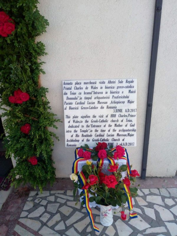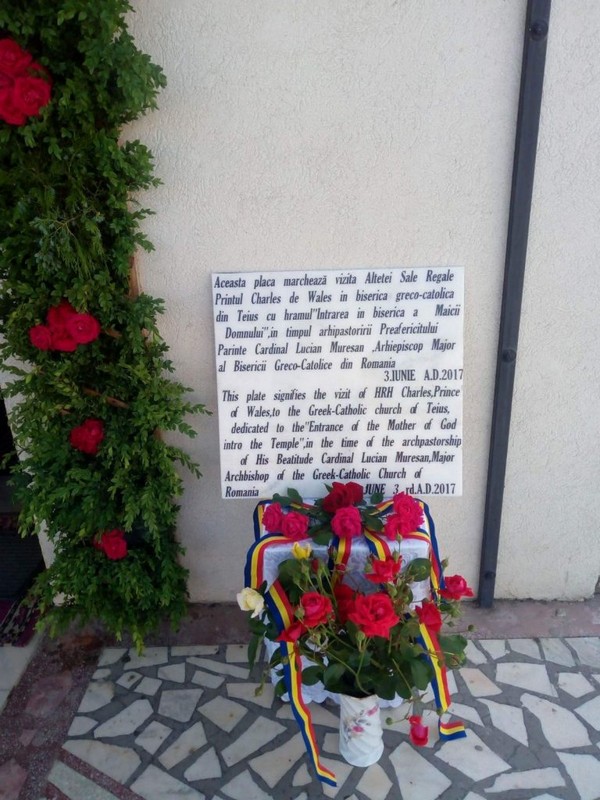 Pentru a marca vizita Prințului Charles de astăzi, 3 iunie 2017, la Biserica greco-catolică cu hramul „Intrarea în Biserică a Maicii Domnului” din Teiuș, a fost realizată o placă comemorativă cu textul: „Această placă marchează vizita Alteței Sale Regale Prințul Charles de Wales în biserica greco-catolică din Teiuș cu hramul „Intrarea în biserică a Maicii Domnului”, în timpul arhipăstoririi Preafericitului Părinte Cardinal Lucian Mureșan, Arhiepiscop Major al Bisericii Greco-Catolice din România. 3 iunie A.D. 2017”.