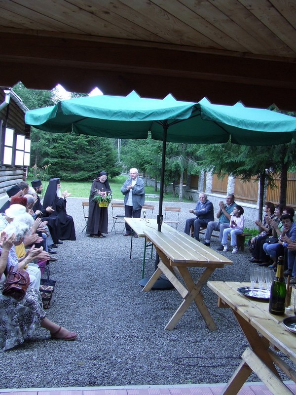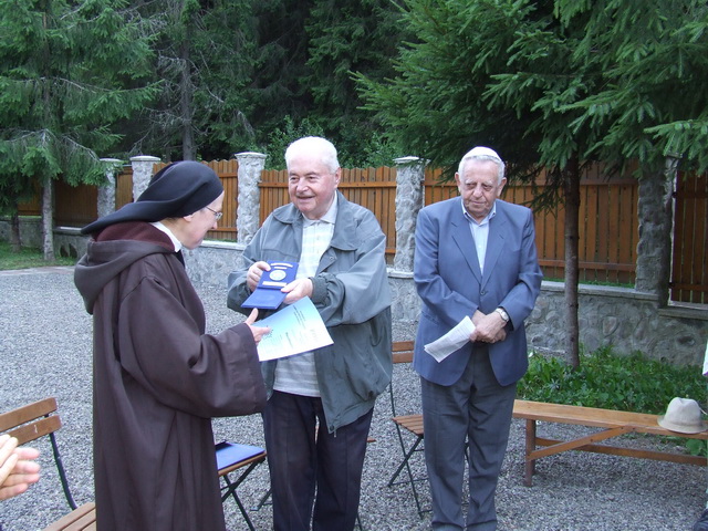 În asistenţă s-a găsit şi un grup venit din Târgu Mureş, pentru următorul moment festiv din programul zilei, desfăşurat, de data aceasta în foişorul din preajma bisericii schitului: înmânarea Diplomei de onoare „Prieten al Comunităţilor Evreieşti din România” Maicii Éliane, stareţa Schitului „Sfânta Cruce”, din partea Federaţiei Comunităţilor Evreieşti din România, prin reprezentanţii săi mureşeni. Această decernare a fost motivată astfel în textul brevetului: „Activitatea susţinută în cadrul Fraternităţii «Sfântul Ilie», orientată spre cunoaşterea legăturii spirituale între evrei şi creştini, în respect faţă de valorile iudaismului; dezvoltarea relaţiilor spirituale cu evreii, implicarea în combaterea antisemitismului şi negaţionismului Holocaustului; sprijinul acordat la realizarea lucrării «În memoria celor 5493 de evrei din Târgu Mureş, ucişi în Şoah»; ataşamentul faţă de Comunitatea Evreilor din Târgu Mureş, prin participarea reciprocă la programele şi ceremoniile organizate”. Maica Éliane a subliniat că în centrul îndemnurilor Regulii Carmelului se află Dt 6,5 – „Să-L iubeşti pe Domnul Dumnezeul tău din toate puterile tale” – care face parte din Shema, rugăciune anterioară erei creştine, pe care evreii evlavioşi o recită de două ori pe zi, seara şi dimineaţa, crez fundamental al iudaismului. Dt 6,5, citat frecvent de Părinţii Bisericii, text esenţial pentru Israel, este, la fel, esenţial şi pentru tradiţia carmelitană. Întemeierea primilor călugări, operă care a fost mult timp considerată ca regulă primară, îl prezintă ca „primul dintre toate preceptele”. Dt 6,5 ocupă un loc central în opera Sfântului Ioan al Crucii, care scrie: „Aceste cuvinte cuprind tot ceea ce omul spiritual trebuie să facă şi tot ceea ce eu am a-l învăţa pentru a se apropia de Dumnezeu prin unirea voinţei, cu ajutorul iubirii”. Evreii şi creştini sunt uniţi în acest Shema pentru viaţa tuturor.