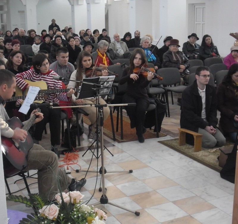 Programul a început la orele 17 cu Rugăciunea Rozariului cântat, iar de la ora 18 Adorație Euharistică, momente în cadrul cărora tinerii de la Cluj-Napoca, majoritatea studenți la Conservator au încununat seara de rugăciune cu vocile lor minunate acompaniate de instrumentele la care exceleaza mulți dintre aceștia, intonând cântece euharistice într-un glas angelic.