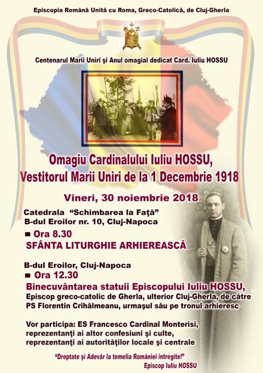 Moment de referință pentru acest An Centenar al Unirii și An omagial Iuliu Hossu, va fi ziua de vineri, 30 noiembrie 2018, prin programul care va debuta la ora 8.30, în Catedrala „Schimbarea la Față” – prin celebrarea Sfintei Liturghii Arhierești solemne în memoria Cardinalului Iuliu Hossu. Această biserică a fost primită ca donație pontificală în 1924, devenită Catedrală în 1930 (după mutarea sediului episcopal la Cluj) și, de aici, marele Ierarh român unit Iuliu Hossu și-a păstorit turma încredințată, până la arestarea sa, din 28/29 noiembrie 1948 și desființarea prin lege a Bisericii Române Unită cu Roma, Greco-Catolică, din 1 decembrie 1948.