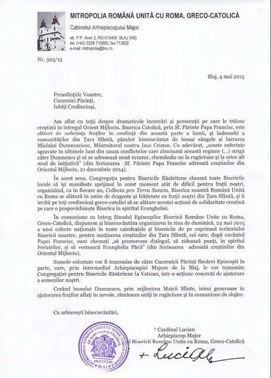 În comuniune cu întreg Sinodul Episcopilor Bisericii Române Unite cu Roma, Greco-Catolică, dispunem şi binecuvântam organizarea în ziua de duminică, 24 mai 2015 a unei colecte naţionale în toate catedralele şi bisericile de pe cuprinsul teritoriului Bisericii noastre, pentru susţinerea creştinilor din Ţara Sfântă, cei care, după cuvântul Papei Francisc, sunt chemaţi „să promoveze dialogul, să zidească punţi, în spiritul Fericirilor, şi să vestească Evanghelia Păcii” (din Scrisoarea adresată creştinilor din Orientul Mijlociu).