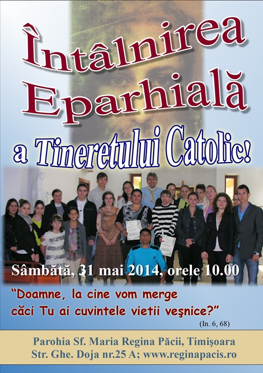Parohia „Sfânta Maria regina Păcii” din Timişoara, va găzdui cea de-a XV-a ediţie a Întâlnirii Tinerilor din Eparhia de Lugoj care va avea loc sâmbătă, 31 mai 2014. Ediţia din acest an este organizată de Biroul Pastoral pentru Tineret al Eparhiei de Lugoj în colaborare cu ASTRU Eparhial Lugoj şi Parohia “Sfânta Maria Regina Păcii” din Timişoara. Moto-ul întâlnirii este: „Doamne, la cine să mergem? Tu ai cuvintele vieții veșnice.” Ioan 6,68