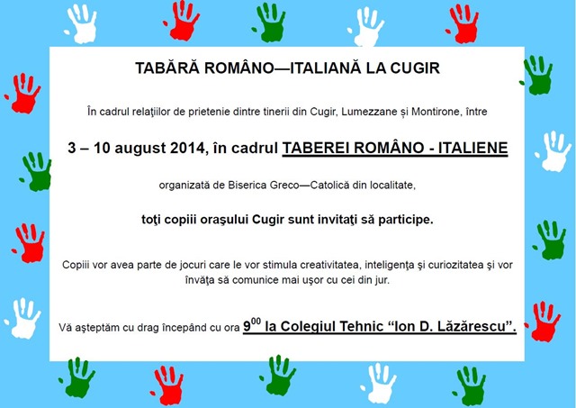 Cu multă bucurie vă invităm și anul acesta la activitățile taberei noastre de la Cugir. În cadrul acestei tabere vor avea loc o mare varietate de activități estivale specifice diferitelor vârste ale copiilor și tinerilor participanți la tabără. Participanții vor avea parte de jocuri, cântece, bansuri și alte activități care le vor stimula creativitatea, inteligenţa şi curiozitatea şi vor învăţa să interacționeze și să comunice mai uşor cu cei din jur.