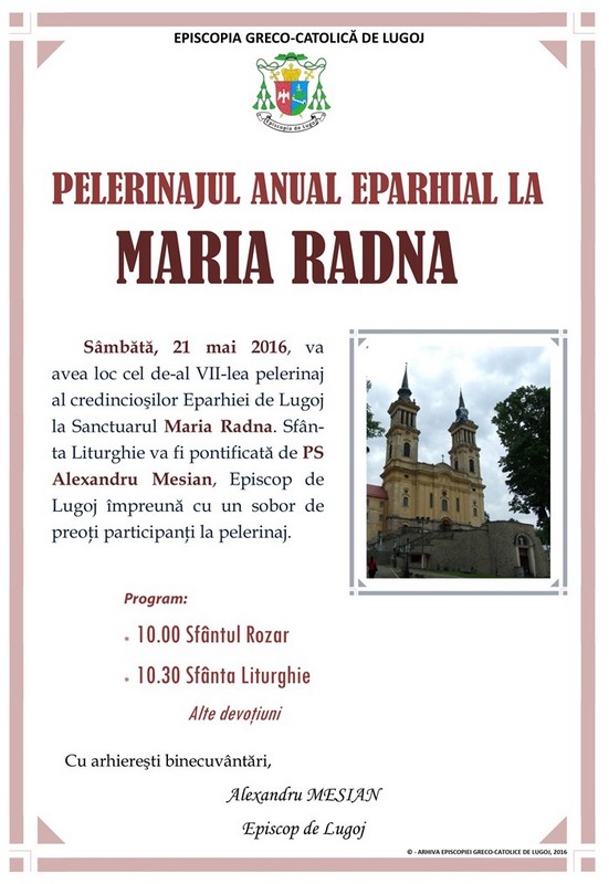 Anunţ: Pelerinajul credincioşilor din Eparhia de Lugoj la Bazilica Maria Radna