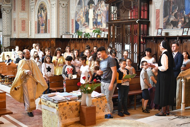 În Catedrala din Lugoj a avut loc, sâmbătă, 17 septembrie, deschiderea anului catehetic 2016-2017. Elevii conduşi de Sora Valeria Bolfă, OSBM, au intrat în biserică în procesiune, doi câte doi, cântând şi aducând cu ei: Sfânta Cruce, lumânări aprinse, Biblia, catehismele, manualele şcolare … pe care le-au pus pe o măsuţă spre a fi binecuvântate.