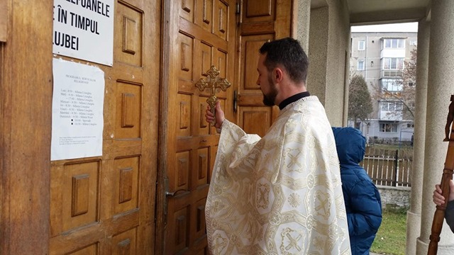 A urmat momentul în care, preotul a bătut cu Sfânta Cruce în porțile bisericii, întocmai ca în noaptea Învierii.
