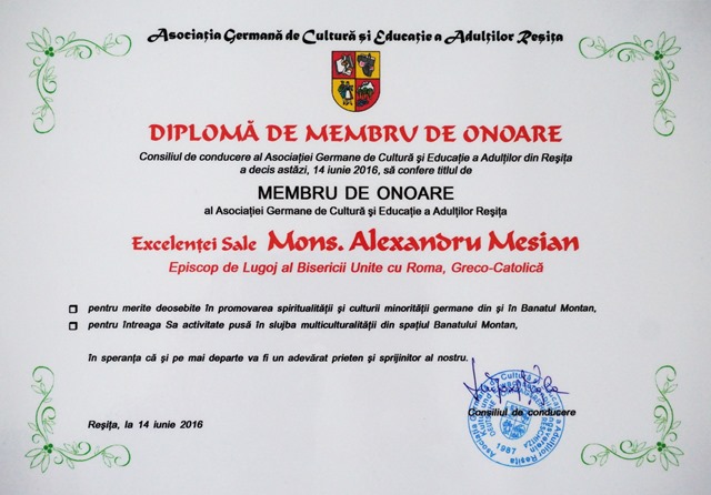 Forumul Democratic al Germanilor din Jud. Caraş-Severin, Biblioteca Judeţeană „Paul Iorgovici” – secţia germană „Alexander Tietz” din Reşiţa a găzduit în ziua de 14 iunie 2016 lansarea cărţii cu titlul: „File din viaţa mea” al cărei autor este Prea Sfinţitul Alexandru Mesian – Episcop de Lugoj.