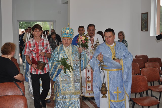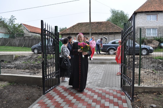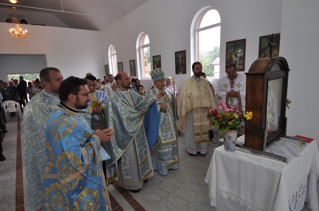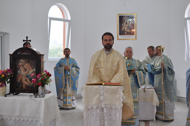 La sosire P.S. Alexandru a fost întâmpinat cu Sfânta Evanghelie şi Sfânta Cruce de pr. Iulian Hasciar, parohul locului şi de pr. Nicolae Teodorescu Vicar Foraneu de Timișoara. A urmat o procesiune cu Icoana care a lăcrimat. Aceasta a fost adusă din vechea biserică şi a purtată de doi tineri în timp ce Prea Sfinţitul Alexandru a binecuvântat lucrările efectuate în noul complex marian: fântâna cu apă curentă, casa pelerinului, platoul şi aleile, zidurile exterioare şi interioare ale noii biserici precum şi crucea restaurată de la intrarea în complex. După ce s-a înconjurat biserica cu icoana Maicii Domnului, aceasta a fost aşezată în faţa Sfântului Altar iar înainte de Sfânta Liturghie a avut loc rugăciunea Sfântului Rozar cu misterele de mărire.